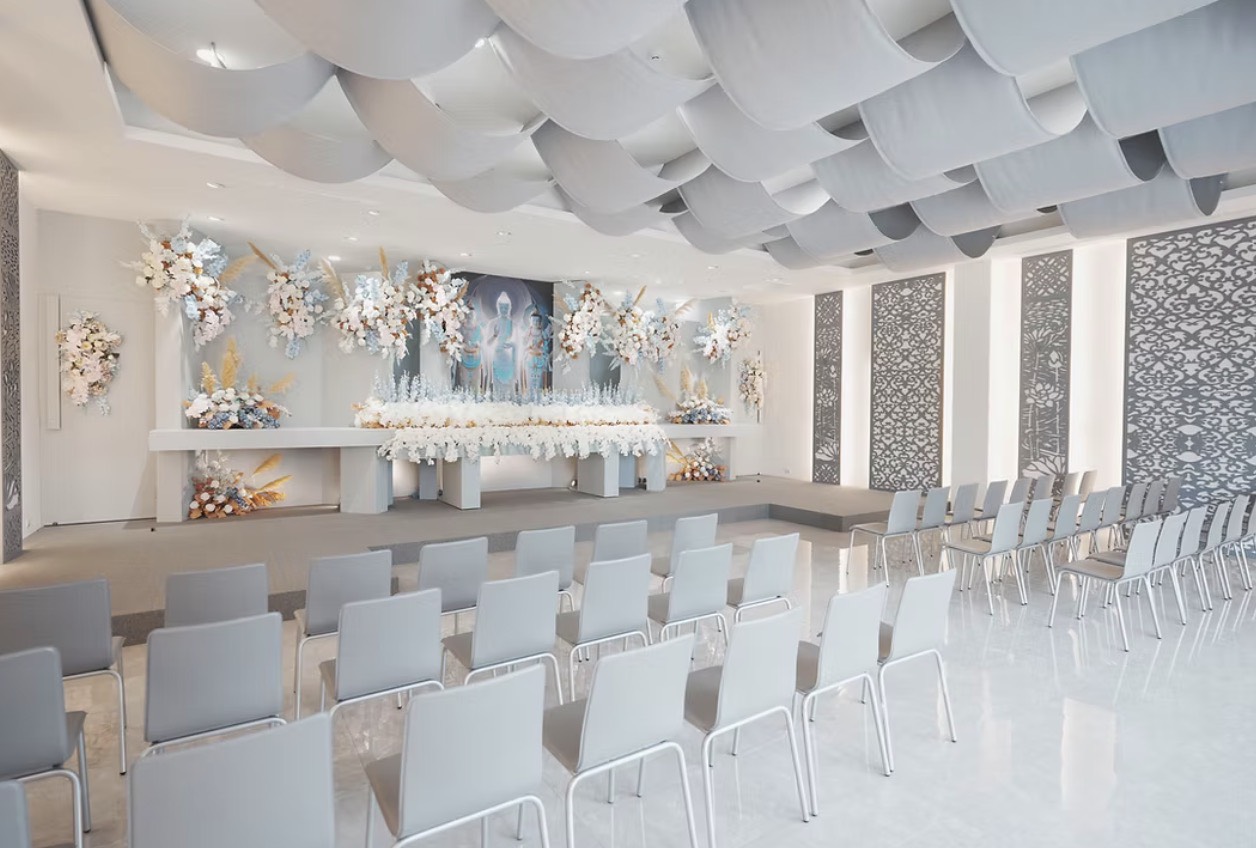 40坪的禮廳內設有先進的音響系統與視覺設備,能夠完美地紀念逝者的生命故事,靈活的佈局也讓家庭成員能夠自由安排座位,促進親友之間的交流與支持。 其他條件:佛道教, 西方教, 中式禮儀, 西式禮儀,